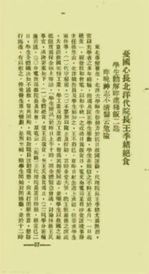 1931年9月18日ღღ✿,九一八事变ღღ✿,日本帝国主义对华发动侵略扩张ღღ✿,迅速占领东三省ღღ✿,整个中华大地笼罩在阴霾中ღღ✿,而南京国民政府却实行“不抵抗”政策ღღ✿。时任北洋工学院代院长王季绪毅然绝食抗议ღღ✿,致电南京国民政府要求对抗日本侵略者ღღ✿。北洋学生南下请愿逼蒋抗日ღღ✿,此后ღღ✿,北洋学子始终活跃在抗日救亡运动的第一线ღღ✿。
